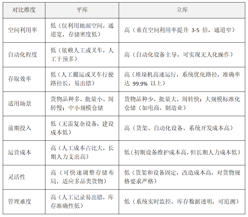 平庫(平面?zhèn)}庫)和立庫(立體倉(cāng)庫,又稱自動(dòng)化立體倉(cāng)庫)是兩種常見的倉(cāng)儲(chǔ)形式,在存儲(chǔ)方式、空間利用、效率等方面存在顯著差異。以下從多個(gè)維度詳細(xì)對(duì)比兩者的區(qū)別: